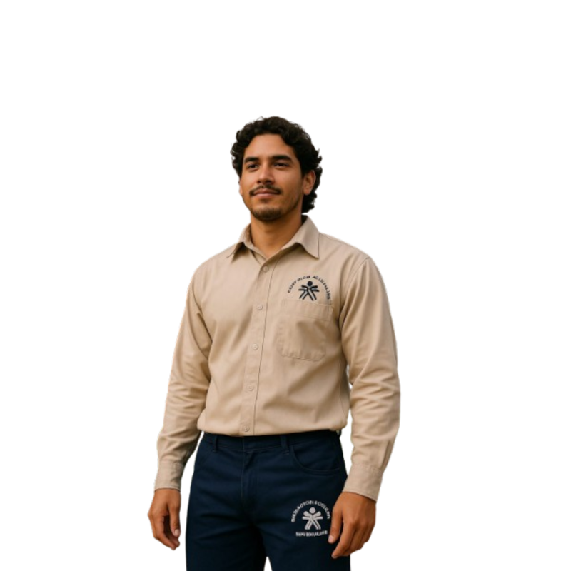 Camisa manga larga color beige en tela resistente, con bolsillo en el pecho y bordado institucional en el lado izquierdo, que garantiza identidad corporativa y estilo formal.